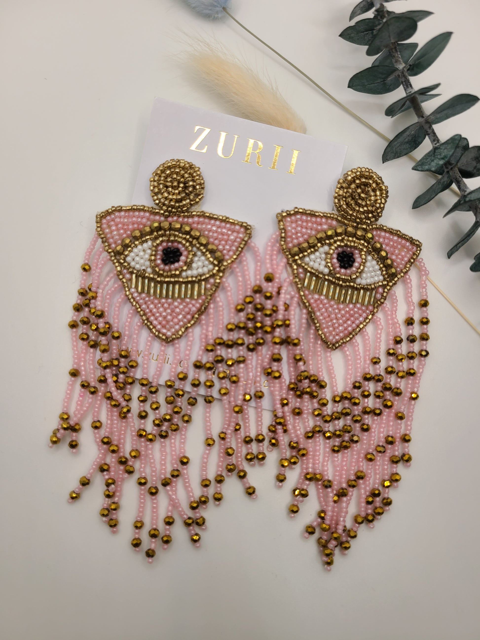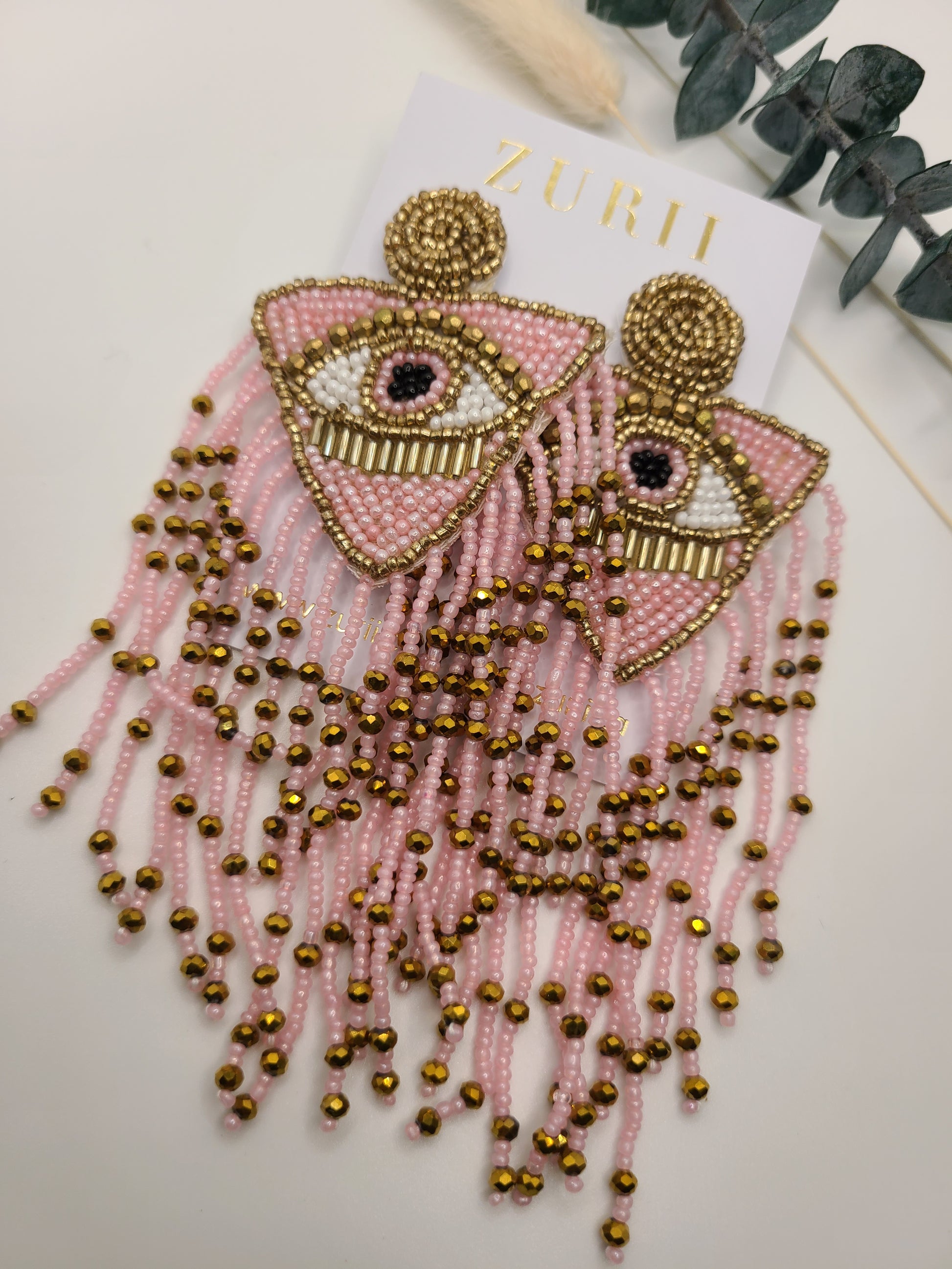 Surrounding the Evil Eye, a combination of tiny seed beads in complementary shades enhances the overall design. The beadwork adds depth and dimension to the earrings, creating an intricate frame that further emphasizes the symbolic significance of the amulet. The meticulous craftsmanship ensures that these earrings shine with every movement.