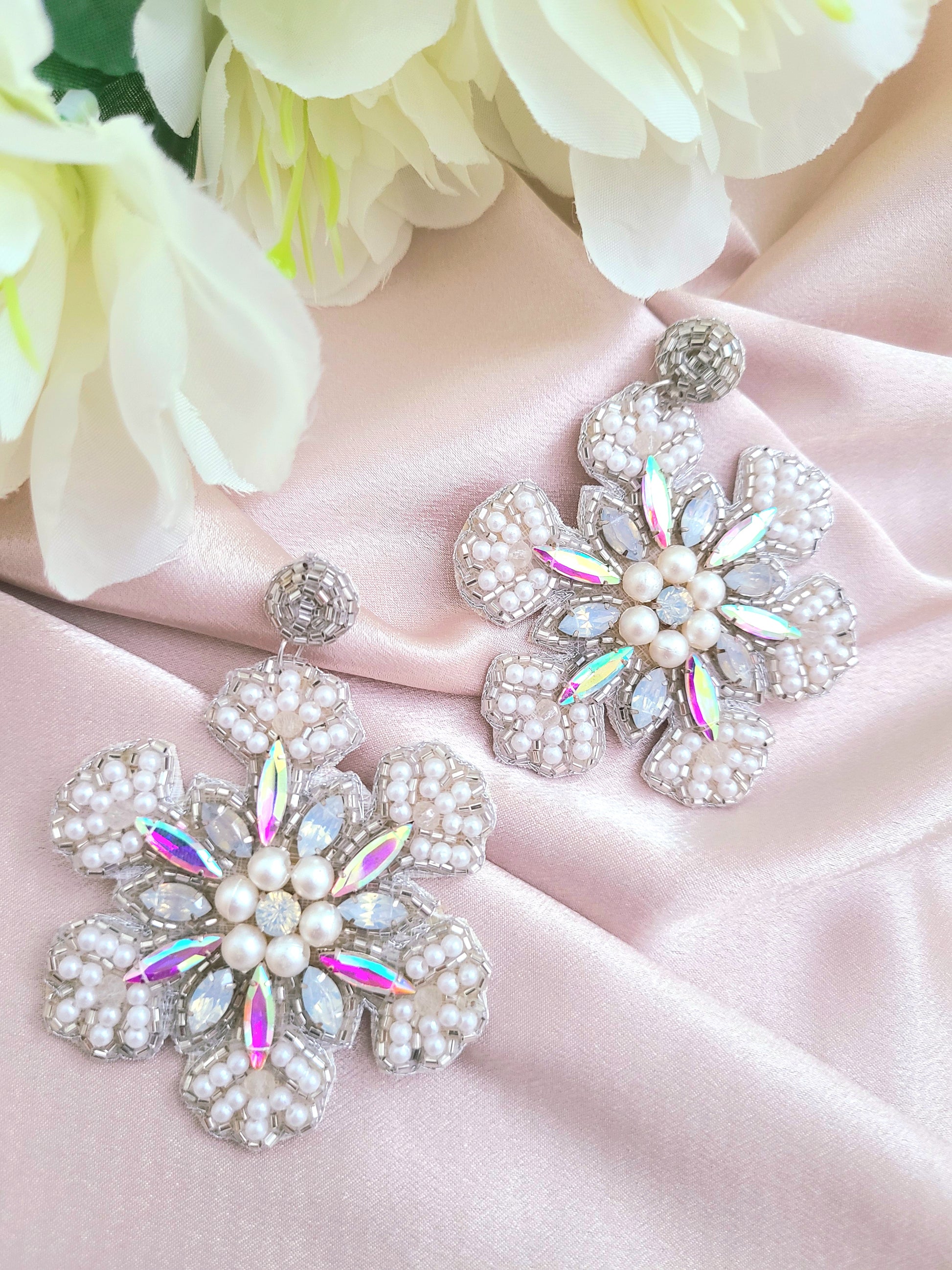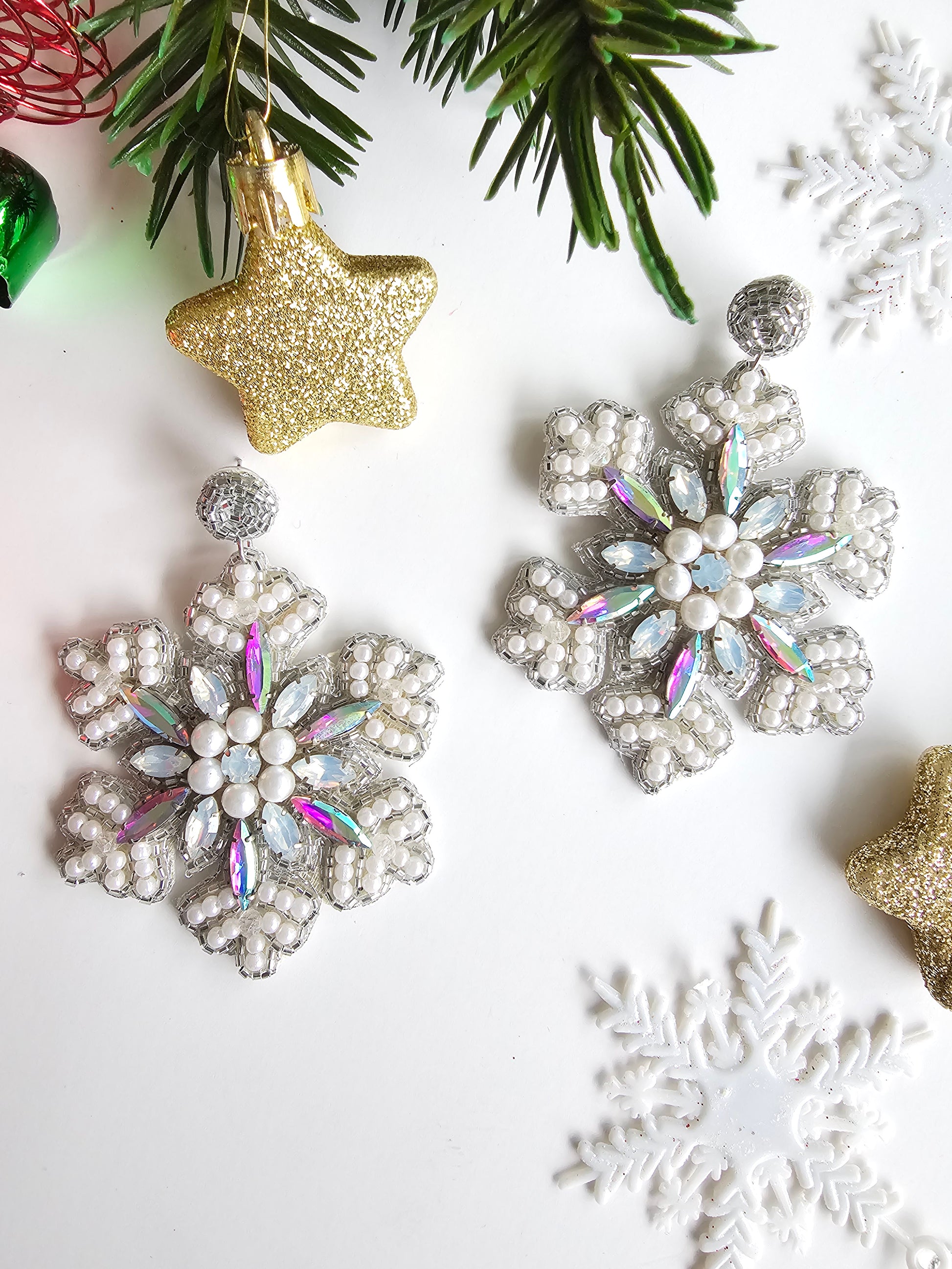 Each earring features a delicate snowflake design, meticulously hand-embroidered with precision using tiny beads and sparkling crystals. The intricate detailing captures the essence of glistening snow, bringing a touch of winter wonder to your ensemble. The beads and crystals are carefully chosen for their quality and brilliance, ensuring that these earrings shimmer and shine with every movement.