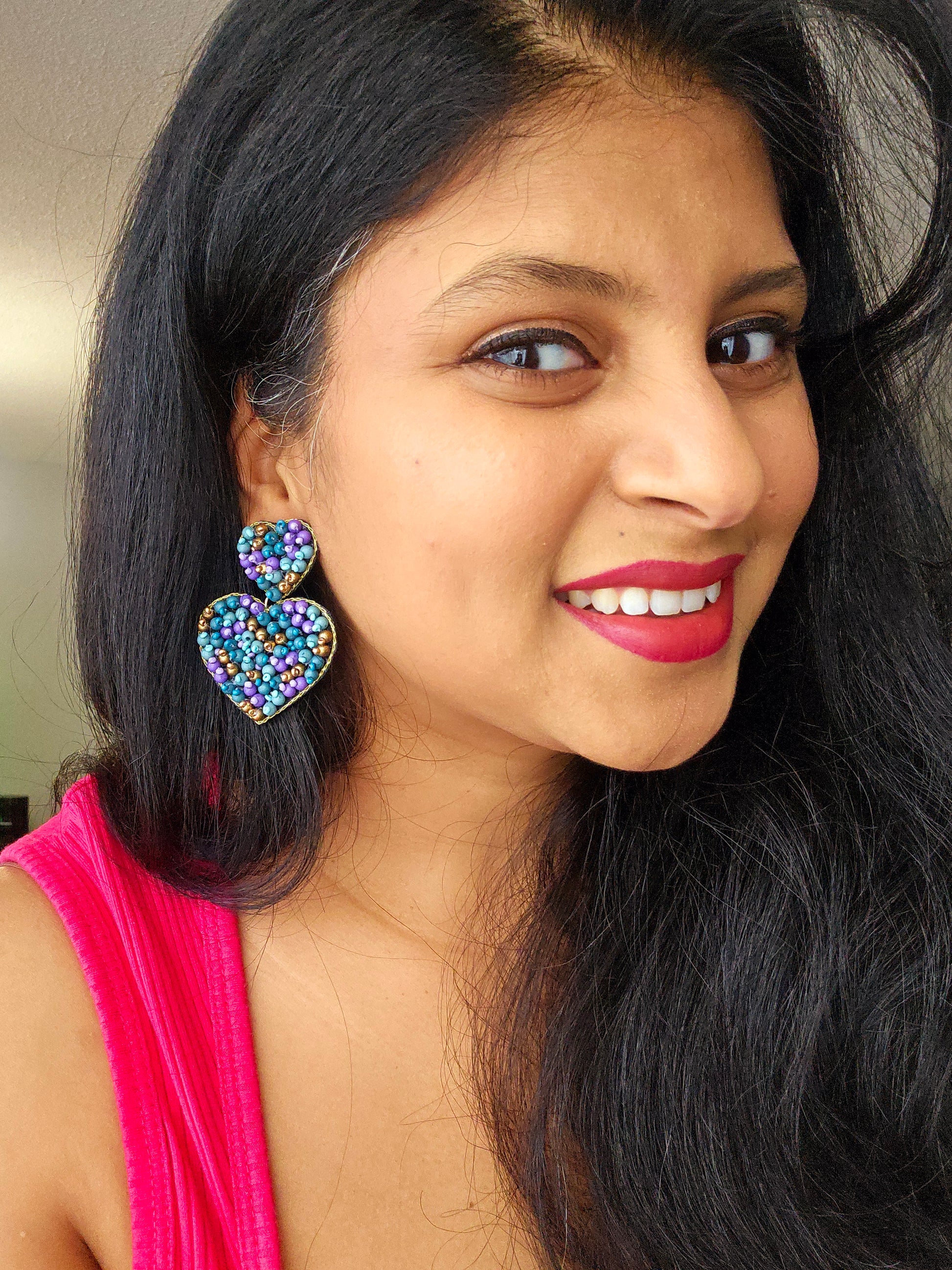 The heart-shaped design is adorned with an array of captivating beads in enchanting shades of blue, complemented by the richness of purple and the warmth of golden accents. The meticulous hand embroidery creates a texture that not only adds depth to the design but also captures the play of light, making these earrings a dazzling statement piece.