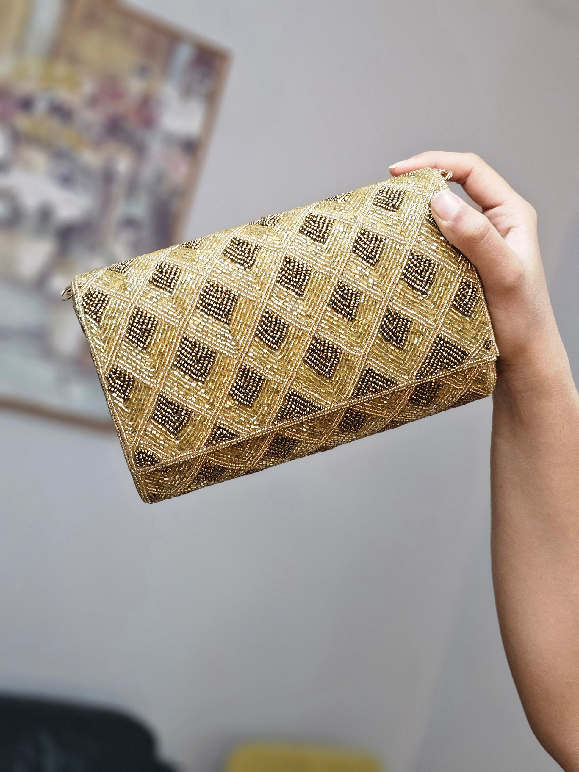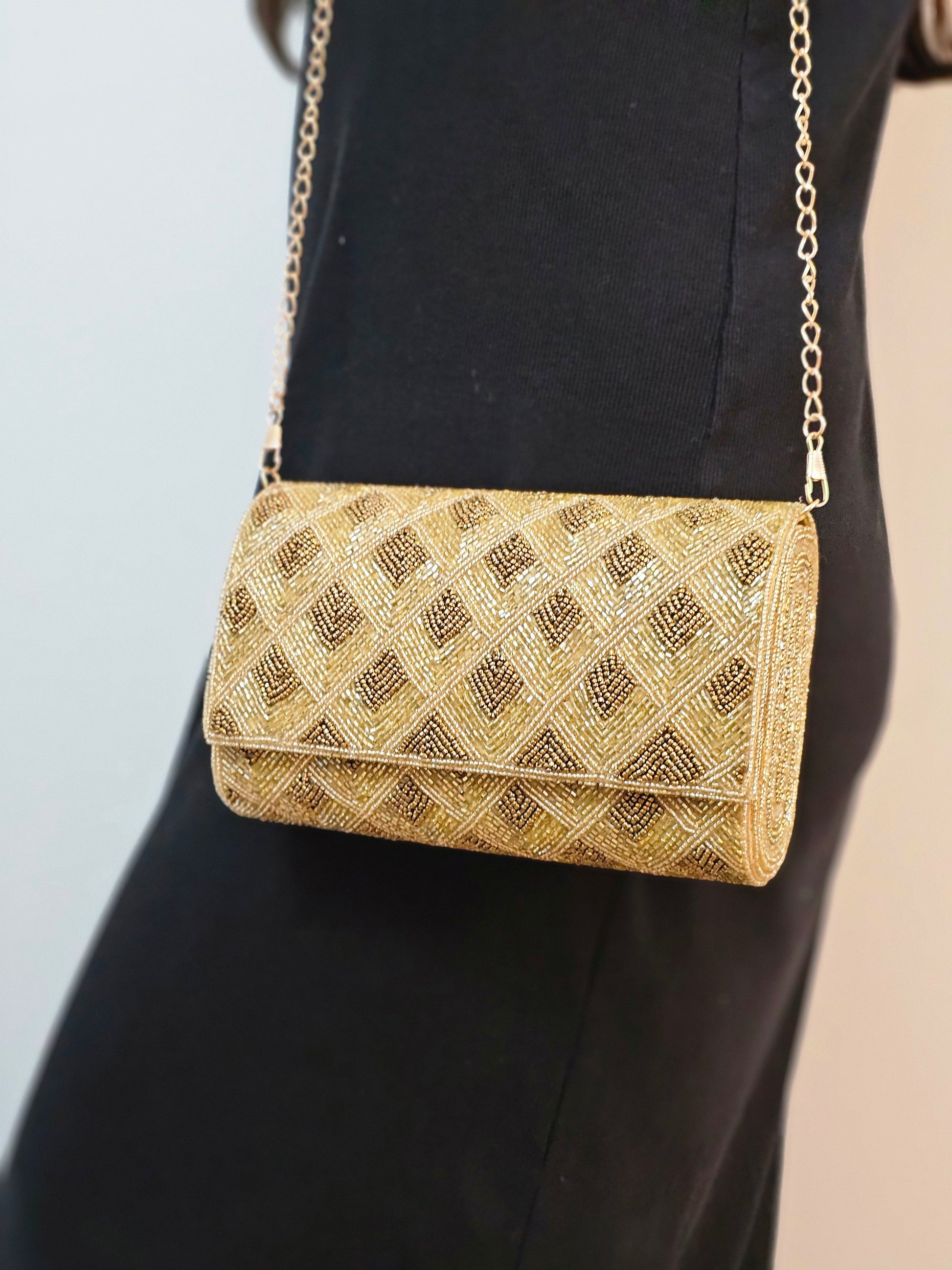 This stunning piece features a geometric design in sparkling gold and black beads, creating a visual masterpiece that is both contemporary and timeless. Perfect for a night out in the city, this clutch adds a touch of sophistication to any ensemble.