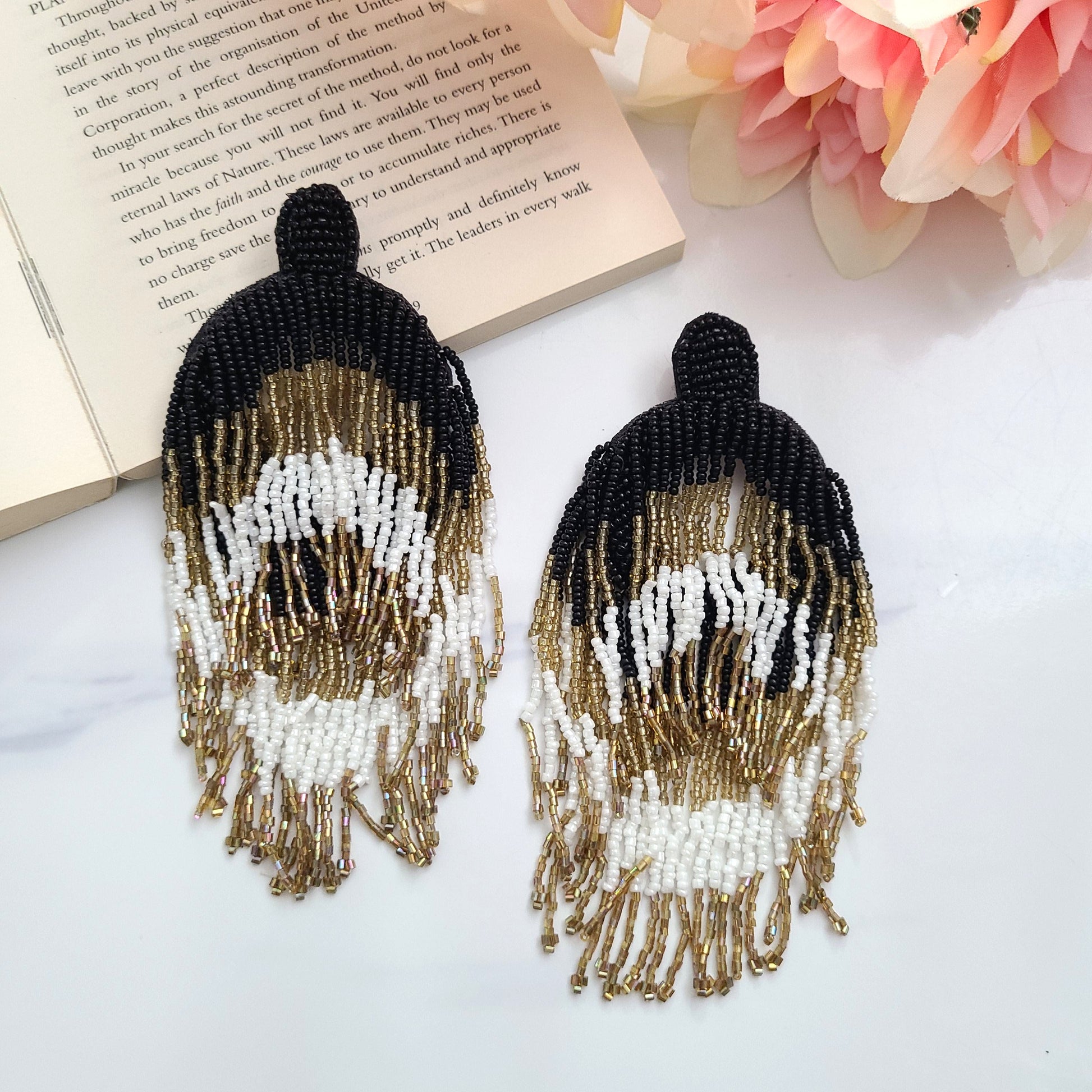 The combination of black, gold, and white beads creates a harmonious palette, allowing these earrings to seamlessly complement both casual and formal outfits. The beads are expertly arranged to form a cascading dangle, providing graceful movement and an alluring silhouette.